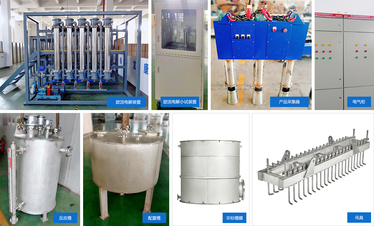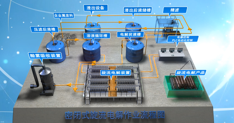 旋流電解裝置是集工藝裝備、電氣設備與控制系統(tǒng)于一體的綜合系統(tǒng)。工藝過程是電解溶液通過溶液輸送泵從貯槽送到按設計排列與布局的旋流電解槽內,溶液在裝置體系內部進行循環(huán),有價金屬離子通過選擇性電解的作用從電解溶液中分離出來并吸附至陰極板上。桶狀產品通過專用產品采集裝置進行采集,粉體產品通過專用粉體采集系統(tǒng)自動進行。桶狀產品進一步通過后序配套的產品加工裝置制成板體產品。與之配套的能夠在高電流密度、高效率運作的智能電源分配裝置系統(tǒng)和綜合控制系統(tǒng),采用冗余硬件系統(tǒng)和全數(shù)字軟件式高精度觸發(fā)調節(jié)控制器,雙工熱備用,抗諧波干擾、抗強磁場干擾,與總控PLC系統(tǒng)通訊共同完成電解電流的智能控制。結合自動控制系統(tǒng)專利技術,實現(xiàn)生產過程中對流量、液位、溫度等的自主檢測,確保規(guī)模化生產中準確性與可靠性操作。